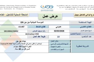 وزارة العمل والتشغيل والضمان الاجتماعي الوكالة الوطنية للتشغيل الفرع الولائي للتشغيل المسيلة الملحقة المحلية للتشغيل بوسعادة ads عـــرض عـمـل الهيئة المستخدمة: المؤسسة العمومية للأشغال العمومية EPTP القطاع القانوني: عـام تاريخ تسجيل عرض العمل: 20/01/2026 مكان العمل: بوسعادة 1.المهنة: مهندس دولة في الميكانيك عدد المناصب …