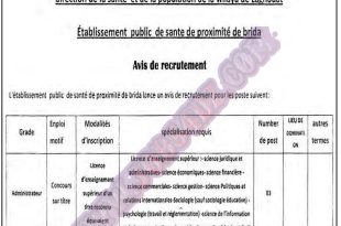 اعلان عن توظيف المؤسسة العمومية للصحة الجوارية بريدة الأغواط ads تعلن المؤسسة العمومية للصحة الجوارية بريدة الأغواط عن فتح مسابقة توظيف على اساس الشهادة في الرتب المبينة ادناه متصرف عدد المناصب 03 منصب نمط التوظيف مسابقة على اساس الشهادة ملف المسابقة على أساس الشهادة …