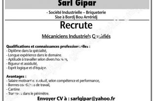 الشركة الصناعية “GIPAR” (مصنع الآجر) المتواجدة ببرج بوعريريج توظف :✓ ميكانيكيون صناعيون مؤهلون (Mécaniciens Industriels Qualifiés) ads المؤهلات المهنية المطلوب بالإضافة إلى المزايا موضحة بالتفصيل في الصورة المرفقةيرجى من المهتمين إرسال سيرهم الذاتية عبر البريد الإلكتروني التالي [email protected]