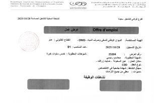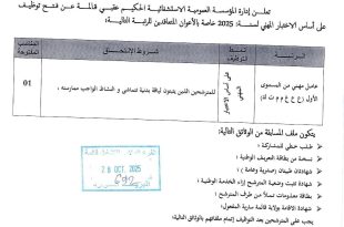 وزارة العمل والتشغيل والضمان الاجتماعي الوكالة الوطنية للتشغيل الفرع الولائي للتشغيل سعيدة ads عرض عمل – Offre d’emploi الهيئة المستخدمة: الديوان الوطني للسقي وصرف المياه – ONID تاريخ التسجيل: 28/10/2025 المهنة المطلوبة: محاسب رئيسي مكان العمل: عين السخونة – ضاية زيارت نوع العقد: CDD …