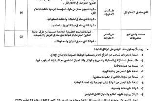 وزارة التعليم العالي والبحث العلمي الديوان الوطني للخدمات الجامعية مديرية الخدمات الجامعية – سيدي بلعباس ads إعلان عن توظيف 27 أكتوبر 2025 تعلن مديرية الخدمات الجامعية سيدي بلعباس عن فتح مسابقة على أساس الاختبار المهني للإلتحاق بمناصب الشغل التالية: منصب الشغلنمط التوظيفعدد المناصبشروط الإلتحاقعون …