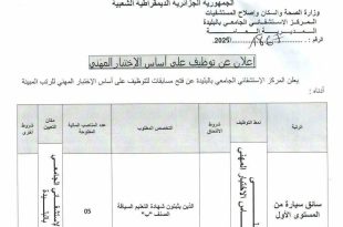 وزارة الصحة والسكان وإصلاح المستشفيات المركز الاستشفائي الجامعي بالبليدة ads إعلان عن توظيف على أساس الإختبار المهني يعلن المركز الاستشفائي الجامعي بالبليدة عن فتح مسابقات للتوظيف على أساس الإختبار المهني للرتب المبينة أدناه: الرتبةنمط التوظيفشروط الإلتحاقالتخصص المطلوبعدد المناصب المالية المفتوحةمكان التعيينشروط أخرىسائق سيارة من …