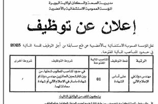 مديرية الصحة والسكان لولاية البويرة المؤسسة العمومية الاستشفائية بالأخضرية ads إعلان عن توظيف تعلن المؤسسة العمومية الاستشفائية بالأخضرية عن فتح مسابقة من أجل التوظيف للسنة المالية 2025 في حدود المناصب المالية المفتوحة. الرتبةنمط التوظيفالمناصب المالية المفتوحةشروط التوظيفشروط أخرىمهندس دولة في الإعلام الآليعلى أساس الشهادة01في …