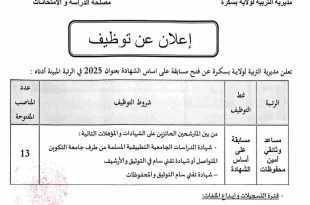 وزارة التربية الوطنية مديرية التربية لولاية بسكرة مصلحة الدراسة والامتحانات ads إعلان عن توظيف تعلن مديرية التربية لولاية بسكرة عن فتح مسابقة على أساس الشهادة بعنوان 2025 في الرتبة المبينة أدناه: الرتبةنمط التوظيفشروط التوظيفعدد المناصب المفتوحةمساعد وثائقي أمين محفوظاتمسابقة على أساس الشهادةمن بين المترشحين …