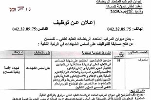 وزارة الرياضة ديوان المركب المتعدد الرياضات العقيد لطفي لولاية تلمسان ads 13 جانفي 2026 إعلان عن توظيف يعلن ديوان المركب المتعدد الرياضات العقيد لطفي – تلمسان عن فتح مسابقة للتوظيف على أساس الشهادات في الرتبة التالية: المنصب المطلوبعدد المناصبالشروط القانونية المطلوبةطرق التوظيفالملاحظاتمتصرف01من بين المترشحين …