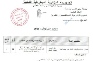 وزارة التعليم العالي والبحث العلمي جامعة يحيى فارس بالمدية الأمانة العامة ads التاريخ: 10 فيفري 2026 إعلان عن توظيف 2026 منصب الشغلنمط التوظيفشروط الالتحاق / التخصص المطلوبعدد المناصبشروط أخرىحارس (متعاقد بالتوقيت الكامل غير محدد المدة)على أساس الاختبار المهنيعلى أساس الاختبار المهني من ضمن المترشحين …