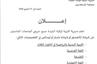 وزارة التربية الوطنية مديرية التربية لولاية البليدة مصلحة المستخدمين ads البليدة في: 12 فيفري 2026 إعـــــــــــلان تعلم مديرية التربية لولاية البليدة جميع خريجي الجامعات الحاصلين على شهادة الماجستير أو شهادة ماستر أو ليسانس في التخصصات التالي: التربية البدنية والرياضية في الأطوار الثلاث اللغة الفرنسية …