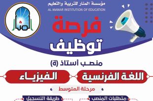 مؤسسة المنار للتربية والتعليم AL MANAR INSTITUTION OF EDUCATION ads فرصة توظيف منصب أستاذ(ة) اللغة الفرنسية | الفيزياء مرحلة المتوسط متطلبات المنصب: الرغبة في التعليم والجدية. شهادة ماستر في التخصص أو شهادة ليسانس مع خبرة. بيئة محفزة. فريق عمل منسجم. مرافقة وتكوين مستمر. طريقة …