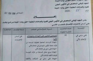 وزارة التكوين و التعليم المهنيين مديرية التكوين و التعليم المهنيين لولاية البليدة المعهد الوطني المتخصص في التكوين المهني للفنون والصناعات المطبعية – خليل زيات – البليدة ads البليدة في: 07 FEV 2026 إعلان يعلن المعهد الوطني المتخصص في التكوين المهني للفنون والصناعات المطبعية – …