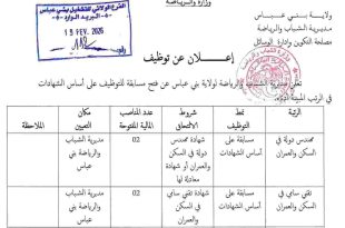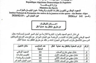 وزارة الرياضة Ministère des Sports المعهد الوطني لتكوين إطارات الشباب والرياضة – عين البنيان – الجزائر ads عين البنيان في: 2026/02/19 اعلان توظيف عن طريق التكفل بعد عملية نقل في إطار تدعيم المعهد بالموارد البشرية اللازمة من أجل السير الحسن لمصالحه، يعلن المعهد الوطني …