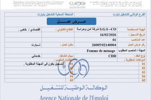 وزارة العمل والتشغيل والضمان الاجتماعي الوكالة الوطنية للتشغيل الفرع الولائي للتشغيل – إيليزي ads إيليزي في: 12-02-2026 عرض عمل توزيع عروض العمل على المكاتب البلدية للتشغيل لولاية إيليزي عرض المؤسسة الوارد بتاريخ تحت رقم -04 / 26 بتاريخ: 11-02-2026 المؤسسة العارضةالمنصب المطلوبرقم العرض بالفرع …