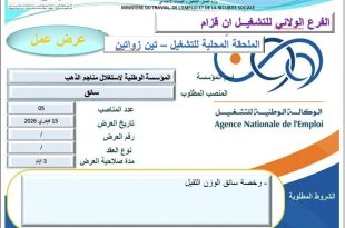 وزارة العمل، التشغيل والضمان الاجتماعي الوكالة الوطنية للتشغيل الفرع الولائي للتشغيل ان قزام الملحقة المحلية للتشغيل – تين زواتين ads عرض عمل اسم المؤسسة: المؤسسة الوطنية لاستغلال مناجم الذهب المنصب المطلوب: سائق عدد المناصب: 05 تاريخ العرض: 15 فيفري 2026 مدة صلاحية العرض: 3 …