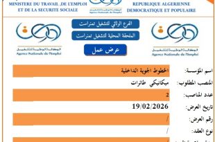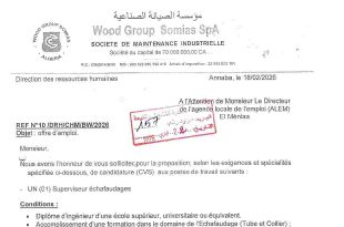 مؤسسة الصيانة الصناعية الوكالة المحلية للتشغيل والمنيعة التاريخ: 22 فيفري 2026 ads عنابة، في 18/02/2026 إلى السيد مدير الوكالة المحلية للتشغيل (ALEM) عرض عمل. يشرفنا أن نطلب منكم اقتراح، وفقاً للمتطلبات والتخصصات المحددة أدناه، لترشيحات (سير ذاتية) لمناصب العمل التالية: واحد (01) مشرف سقالات …