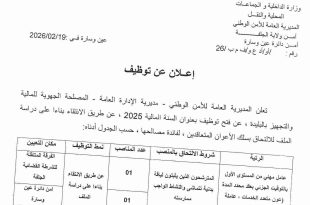 وزارة الداخلية والجماعات المحلية والتهيئة العمرانية المديرية العامة للأمن الوطني مديرية الإدارة العامة المصلحة الجهوية للمالية والتجهيز بتمنراست ads إعلان عن توظيف تعلن المديرية العامة للأمن الوطني – مديرية الإدارة العامة – المصلحة الجهوية للمالية والتجهيز تمنراست، عن فتح عملية التوظيف بعنوان السنة المالية …