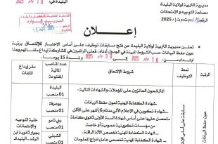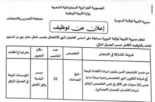 وزارة التربية الوطنية مديرية التربية لولاية البليدة مصلحة التوجيه والامتحانات ads إعــــلان تعلن مديرية التربية لولاية البليدة عن فتح مسابقة توظيف على أساس الاختبار للالتحاق برتبة عون حفظ البيانات و عون إدارة حسب الشروط المبينة في الجدول أدناه، فعلى الراغبين في المشاركة إيداع ملفاتهم …