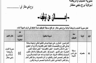 وزارة الشباب والرياضة مديرية الشباب والرياضة لولاية برج باجي مختار ads إعلان عن توظيف تعلن مديرية الشباب والرياضة لولاية برج باجي مختار عن فتح مسابقة توظيف لسنة 2025 في الرتب المبينة أدناه: الرتبةنمط التوظيفشروط المطلوبةعدد المناصبمكان التعيينمتصرفمسابقة على أساس الشهادةالمترشحون الحائزون على شهادة ليسانس …