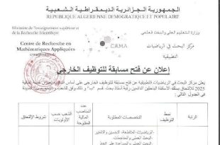 وزارة التعليم العالي والبحث العلمي مركز البحث في الرياضيات التطبيقية ads إعلان عن فتح مسابقة للتوظيف الخارجي يعلن مركز البحث في الرياضيات التطبيقية عن فتح مسابقة للتوظيف الخارجي على أساس الشهادة بعنوان السنة المالية 2025 للالتحاق بسلك الأساتذة الباحثين الدائمين رتبة أستاذ باحث قسم …