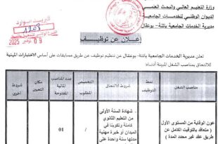وزارة التعليم العالي والبحث العلمي الديوان الوطني للخدمات الجامعية مديرية الخدمات الجامعية باتنة- بوعقال ads إعلان عن توظيف تعلن مديرية الخدمات الجامعية باتنة- بوعقال عن تنظيم توظيف عن طريق مسابقات على أساس الاختبارات المهنية للالتحاق بمناصب الشغل المبينة أدناه: مناصب الشغلنمط التوظيفشروط الالتحاقالتخصص المطلوبعدد …