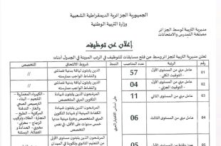وزارة التربية الوطنية مديرية التربية لوسط الجزائر مصلحة التمدرس والامتحانات ads إعلان عن توظيف تعلن مديرية التربية للجزائر وسط عن فتح مسابقات للتوظيف في الرتب المبينة في الجدول أدناه: الرقمالرتبةعدد المناصبالنمطشرط الالتحاق01عون إدارة04توظيفالمترشحون الذين يثبتون مستوى السنة الثالثة من التعليم الثانوي كاملة02عون حفظ البيانات04توظيفالمترشحون …