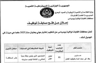 وزارة الفلاحة والتنمية الريفية والصيد البحري المديرية العامة للغابات محافظة الغابات لولاية بومرداس ads إعلان عن فتح مسابقة توظيف تعلن محافظة الغابات لولاية بومرداس عن تنظيم إختبار مهني بعنوان سنة 2025 كما هي مبينة في الجدول أدناه : منصب شغلعدد المناصب المفتوحةنمط التوظيفشروط المشاركة …