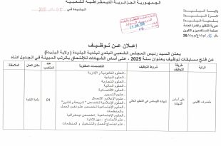 أكمل القراءة »إعلان عن توظيف بالمجلس الشعبي البلدي