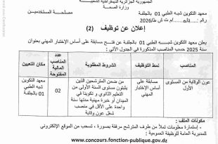 وزارة الصحة معهد التكوين شبه الطبي 01 بالجلفة مصلحة المستخدمين ads إعلان عن توظيف يعلن معهد التكوين شبه الطبي 01 بالجلفة عن فتح مسابقة على أساس الاختبار المهني بعنوان سنة 2025 حسب المناصب المذكورة في الجدول الآتي: المناصبنمط التوظيفالشروط المطلوبةعدد المناصب المالية المفتوحةمكان التعيينعون …