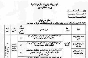 وزارة الثقافة والفنون ولاية مستغانم المكتبة الرئيسية للمطالعة العمومية ads إعلان عن توظيف تعلن المكتبة الرئيسية للمطالعة العمومية لولاية مستغانم عن فتح مسابقات للتوظيف في الرتب المبينة أدناه: الرتبةنمط التوظيفشروط الالتحاقعدد المناصب المالية المفتوحةمكان التعيينشروط أخرىمهندس دولة في الإعلام الآليعلى أساس الشهادةللمترشحين الحائزين على …
