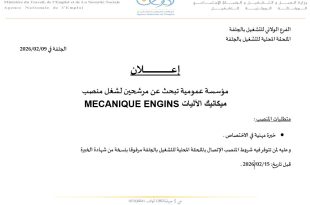 وزارة العمل والتشغيل والضمان الاجتماعي الوكالة الوطنية للتشغيل الفرع الولائي للتشغيل بالجلفة الملحقة المحلية للتشغيل بمسعد ads مسعد في: 09 / 02 / 2026 إعلان مؤسسة اقتصادية عمومية تبحث عن مناصب عمل في التخصصات: 1 – CONDUCTEUR D ENGIN POLYVALENT شروط المنصب: تكوين في …