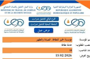 وزارة العمل والتشغيل والضمان الاجتماعي الوكالة الوطنية للتشغيل الفرع الولائي للتشغيل تمنراست الملحقة المحلية للتشغيل تمنراست ads عرض عمل اسم المؤسسة: مؤسسة الخبير للنظافة، الصيانة والتطهير المنصب المطلوب: عاملة نظافة عدد المناصب: 18 تاريخ العرض: 15/02/2026 نوع العقد: CDD مدة صلاحية العرض: 06 أيام …