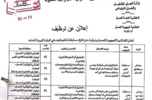 اعلان عن توظيف ads تعلن المفتشية الجهوية للعمل بتيارت عن فتح مسابقات للتوظيف في الرتب المبينة أدناه: مفتش مركزي للعمل 05 مناصب مفتش رئيسي للعمل 03 مناصب نمط التوظيف: مسابقة على أساس الشهادات يحتوي ملف الترشح على الوثائق التالية: طلب خطي للمشاركة في المسابقة …