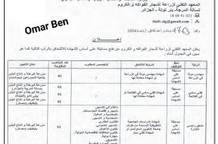 الجمهورية الجزائرية الديمقراطية الشعبية وزارة الفلاحة والتنمية الريفية والصيد البحري المعهد التقني لزراعة أشجار الفواكه والكروم تسالة المرجة، بئر توتة – الجزائر ads إعلان عن فتح مسابقة على أساس الشهادة للالتحاق بالرتب التالية: يُعلن المعهد التقني لزراعة أشجار الفواكه والكروم عن فتح مسابقة على …