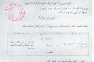 الجمهورية الجزائرية الديمقراطية الشعبية وزارة الفلاحة والتنمية الريفية والصيد البحري المعهد الوطني لحماية النباتات ads إعلان عن توظيف يوظف المعهد الوطني لحماية النباتات عن طريق الاختبار المهني لشغل المناصب التالية: اسم المنصبالعددمكان التعيينالشروط المطلوبةحارس بالتوقيت الكامل والمدة غير محددة03بسكرةتلمسانالجزائر (المقر)المترشحون الذين يثبتون لياقة بدنية …
