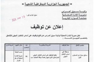 الجمهورية الجزائرية الديمقراطية الشعبية ولاية سوق أهراس مديرية الإدارة المحلية مصلحة الموارد البشرية ads إعلان عن توظيف تعلن مديرية الإدارة المحلية لولاية سوق أهراس عن فتح توظيف على أساس الاختبار المهني للالتحاق بالمنصب المبين أدناه: يشتمل ملف الترشح على: طلب خطي للمشاركة في المسابقة …