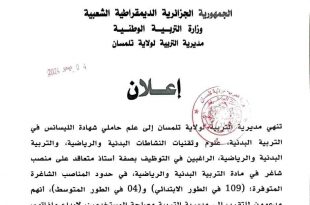 الجمهورية الجزائرية الديمقراطية الشعبية وزارة التربية الوطنية مديرية التربية لولاية تلمسان ads إعلان تدعو مديرية التربية لولاية تلمسان كل حاملي شهادة الليسانس في التربية البدنية، علوم وتقنيات النشاطات البدنية والرياضية، والتربية البدنية والرياضية، الراغبين في التوظيف بصفة أستاذ متعاقد على منصب شاغر في مادة …
