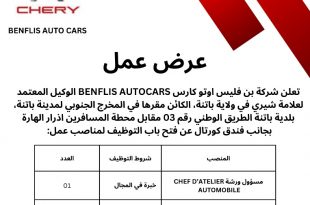 عروض عمل ads تعلن شركة بن فليس أوتو كارز BENFLIS AUTOCARS الوكيل المعتمد للعلامة شيري في ولاية باتنة الكائن مقرها في المخرج الجنوبي لمدينة باتنة، بلدية باتنة، الطريق الوطني رقم 03 مقابل محطة المسافرين اذرار الهارة، بجانب فندق كورتال عن فتح باب التوظيف للمناصب …