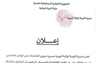 الجمهورية الجزائرية الديمقراطية الشعبية وزارة التربية الوطنية مديرية التربية لولاية البويرة ads إعلان تعلن مديرية التربية لولاية البويرة لجميع خريجي الجامعات عبر الوطن الحاصلين على شهادة الليسانس في الفنون التشكيلية والموسيقى الراغبين في التوظيف بالتعاقد كأساتذة لمادتي الرسم والموسيقى في التعليم المتوسط يمكنهم الاتصال …
