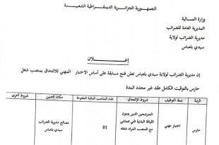 الجمهورية الجزائرية الديمقراطية الشعبية وزارة المالية المديرية العامة للضرائب مديرية الضرائب لولاية سيدي بلعباس ads إعلان إن المديرية الولائية للضرائب بسيدي بلعباس تعلن فتح مسابقة على أساس الاختبار المهني للالتحاق بمنصب شغل حارس بالتوقيت الكامل عقد غير محدد المدة. جميع مسابقات وإعلانات التوظيف نوفمبر …