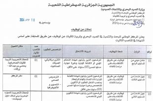 الجمهورية الجزائرية الديمقراطية الشعبية وزارة الصيد البحري والمنتجات الصيدية المركز الوطني للبحث والتنمية في الصيد البحري وتربية المائيات ads إعلان عن توظيف يعلن المركز الوطني للبحث والتنمية في الصيد البحري وتربية المائيات عن توظيف عن طريق المسابقة على أساس الشهادة في المناصب التالية: جميع …