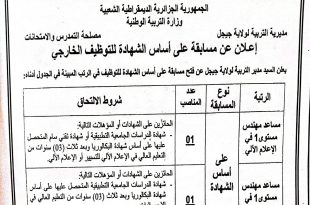 الجمهورية الجزائرية الديمقراطية الشعبية وزارة التربية الوطنية مديرية التربية لولاية جيجل إعلان عن مسابقة على أساس الشهادة للتوظيف الخارجي ads يعلن السيد مدير التربية لولاية جيجل عن فتح مسابقة على أساس الشهادة للتوظيف في الرتب المبينة في الجدول أدناه: المناصبنوع المسابقةشروط الالتحاقعددمساعد مهندس مستوى …