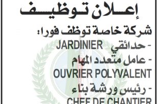 إعلان توظيف ads شركة خاصة توظف فوراً: حدائقي عامل متعدد المهام رئيس ورشة بناء سائق شاحنة صنف C سائق شاحنة مقطورة مهندس فلاحي ذو خبرة معتبرة رئيس ورشة العتاد ميكانيكي للتواصل: رقم الهاتف: 0654.88.39.00 البريد الإلكتروني: موضح في الصورة ادناه جميع مسابقات وإعلانات التوظيف …