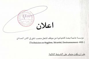 الفرع الولائي للتشغيل بالجلفة الملحقة المحلية للتشغيل بعين الابل ads إعلان مؤسسة خاصة تبحث عن موظف لشغل منصب فني في السلامة والصحة المهنية والبيئة (Technicien en Hygiène, Sécurité, Environnement – HSE). على الراغب في التقديم أن يكون حاصلاً على الشهادات المؤهلة. على من تتوفر …