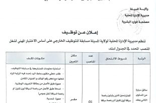 الجمهورية الجزائرية الديمقراطية الشعبية ولاية المسيلة مديرية الإدارة المحلية مصلحة الموارد البشرية ads إعلان عن توظيف تنظم مديرية الإدارة المحلية لولاية المسيلة مسابقة توظيف خارجية على أساس الاختبار المهني لشغل المنصب المحدد في الجدول أدناه. الرقم الترتيبيالمسمى الوظيفيعدد المناصبمكان التعيينالشروط المطلوبة01سائق سيارة نقل عمومي …