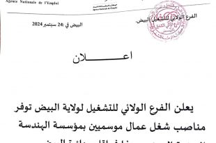 أكمل القراءة »يعلن الفرع الولائي للتشغيل عن توفر مناصب شغل عمال موسميين بمؤسسة الهندسة الريفية