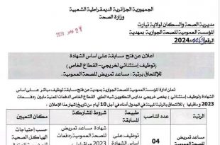 الجمهورية الجزائرية الديمقراطية الشعبية وزارة الصحة والسكان وإصلاح المستشفيات المديرية الولائية للصحة المؤسسة العمومية للصحة الجوارية بالمهدية تيارت التاريخ: 21 أكتوبر 2024 ads إعلان عن فتح مسابقة على أساس الشهادة تعلن المؤسسة العمومية للصحة الجوارية بالمهدية تيارت عن فتح مسابقة توظيف استثنائي (يخص خريجي …