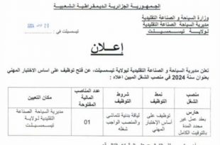 الجمهورية الجزائرية الديمقراطية الشعبية وزارة السياحة والصناعة التقليدية مديرية السياحة والصناعة التقليدية لولاية تيسمسيلت ads إعلان عن توظيف تعلن مديرية السياحة والصناعة التقليدية لولاية تيسمسيلت عن فتح مسابقة توظيف على أساس الشهادة، بعنوان السنة 2024 في هذه المناصب: جميع مسابقات وإعلانات التوظيف نوفمبر 2025 …