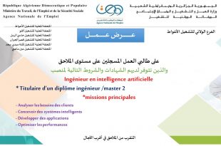 الجمهورية الجزائرية الديمقراطية الشعبيةوزارة العمل والتشغيل والضمان الاجتماعيالوكالة الوطنية للتشغيل ads عرض عمل على طالبي العمل المسجلين على مستوى الملحقاتوالذين تتوفر لديهم الشهادات والشروط التالية لمنصب: Ingénieur en intelligence artificielle Titulaire d’un diplôme ingénieur / master 2 Missions principales Analyser les besoins des clients …