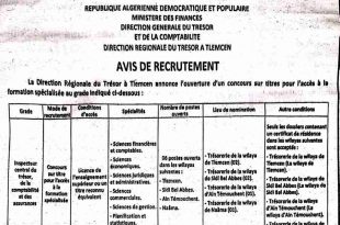 أكمل القراءة »إعلان عن توظيف بالمديرية الجهوية للخزينة في تلمسان سيدي بلعباس عين تيموشنت والنعامة