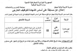 أكمل القراءة »إعلان عن مسابقة على أساس الشهادة للتوظيف الخارجي بمديرية التربية لولاية جيجل