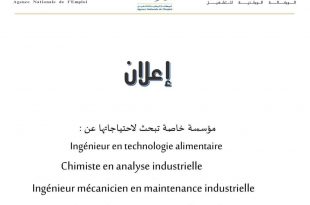 الجمهورية الجزائرية الديمقراطية الشعبية وزارة العمل والتشغيل والضمان الاجتماعي الوكالة الوطنية للتشغيل ads إعلان مؤسسة خاصة تبحث لاحتياجاتها عن: مهندس في تكنولوجيا غذائية كيميائي في التحليل الصناعي مهندس ميكانيكي في الصيانة الصناعية مهندس صيانة صناعية فني أوتوماتيكي صيانة كهروميكانيكي على الراغبين بالعمل بهذه المؤسسة …