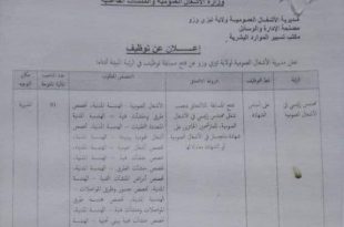 الجمهورية الجزائرية الديمقراطية الشعبية وزارة الاشغال العمومية والمنشات القاعدية مديرية الاشغال العمومية لولاية تيزي وزو مصلحة الادارة والوسائل مكتب تسيير الموارد البشرية ads إعلان عن توظيف تعلن مديرية الاشغال العمومية لولاية تيزي وزو عن فتح توظيف على أساس الشهادة للالتحاق بمنصب الشغل: جميع مسابقات …